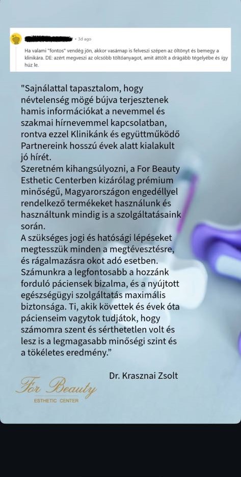 A sebész persze ezt rögtön cáfolta, és azt mondja, jogi útra tereli az ügyet, ugyanis ez szerinte a megtévesztés és rágalmazás kategóriája. „Sajnálattal tapasztalom, hogy névtelenség mögé bújva terjesztenek hamis információkat a nevemmel és a szakmai hírnevemmel kapcsolatban, rontva ezzel klinikánk és együttműködő partnereink hosszú évek alatt kialakult jó hírét. Szeretném kihangsúlyozni, a For Beauty Esthetic Centerben kizárólag prémiumminőségű, Magyarországon engedéllyel rendelkező termékeket használunk és használtunk mindig is a szolgáltatásaink során. A szükséges jogi és hatósági lépéseket megtesszük minden megtévesztésre és rágalmazásra okot adó esetben. Számunkra a legfontosabb a hozzánk forduló páciensek bizalma és a nyújtott egészségügyi szolgáltatás maximális biztonsága. Ti, akik követtek és évek óta pácienseim vagytok, tudjátok, hogy számomra szent és sérthetetlen volt és lesz is a legmagasabb minőségi szint és a tökéletes eredmény.”