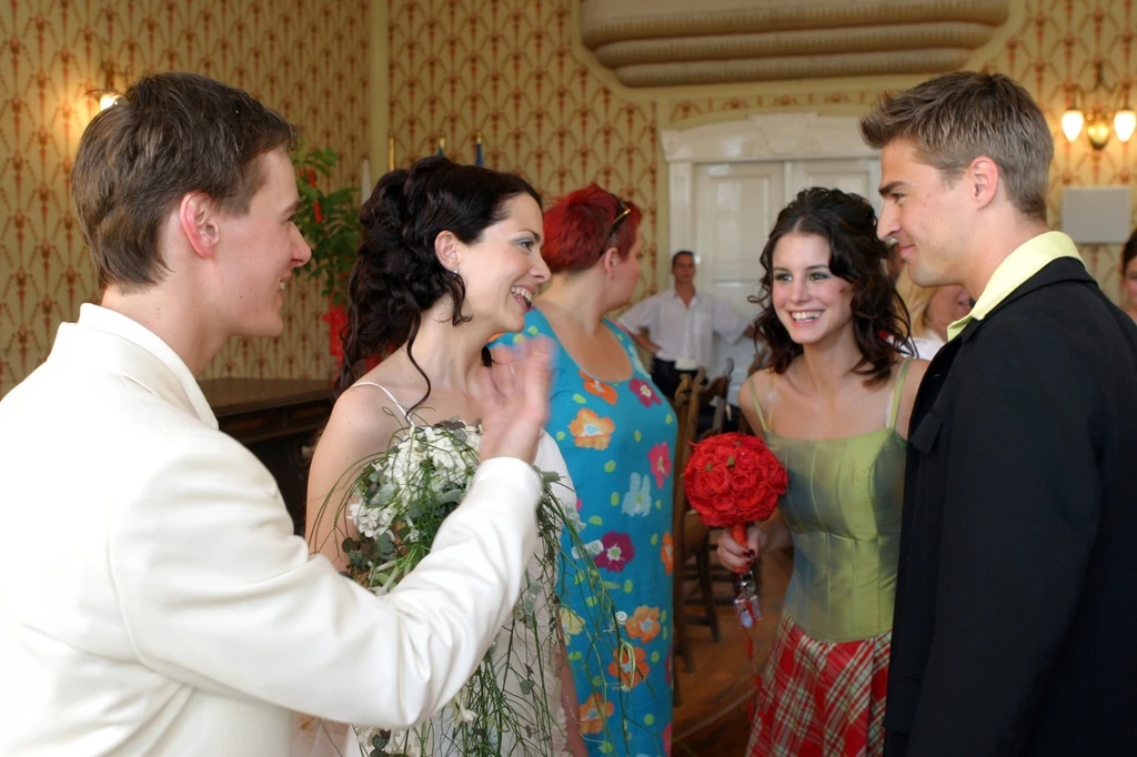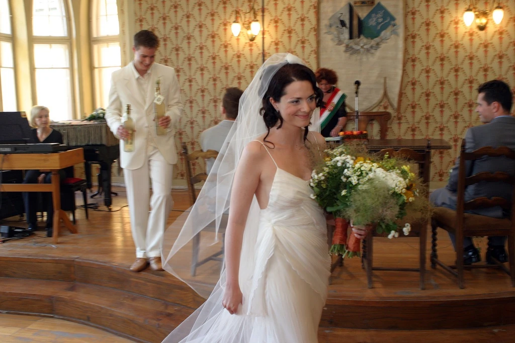 Határozottan, hangosan mondta ki a boldogító igent Deutsch Anita és Kinizsi Ottó az anyakönyvvezető előtt. A házasságkötő-terembe először a vajszínű öltönyt viselő, boldogan mosolygó Ottó érkezett édesanyja kíséretében, majd a menyasszony libegett végig édesapja karján a 200 meghívott között. Anita meseszép volt pántos, a hátat szabadon hagyó, görög stílusú menyasszonyi ruhájában. A városházán nemcsak a barátok és rokonok, hanem sorozatbeli kollégáik is megjelentek. A szertartás előtt a két ifjú sztár, Csifó Dorina és Dósa Mátyás elénekelte az Anita és Ottó legszebb napjára írt dalukat, mely után nem csak a jegyespár, hanem a vendégek is a szemüket törölgették. A pár jó barátja, Zámbori Soma – aki a Barátok köztben Hodász Pétert alakította – egy verssel köszöntötte őket.