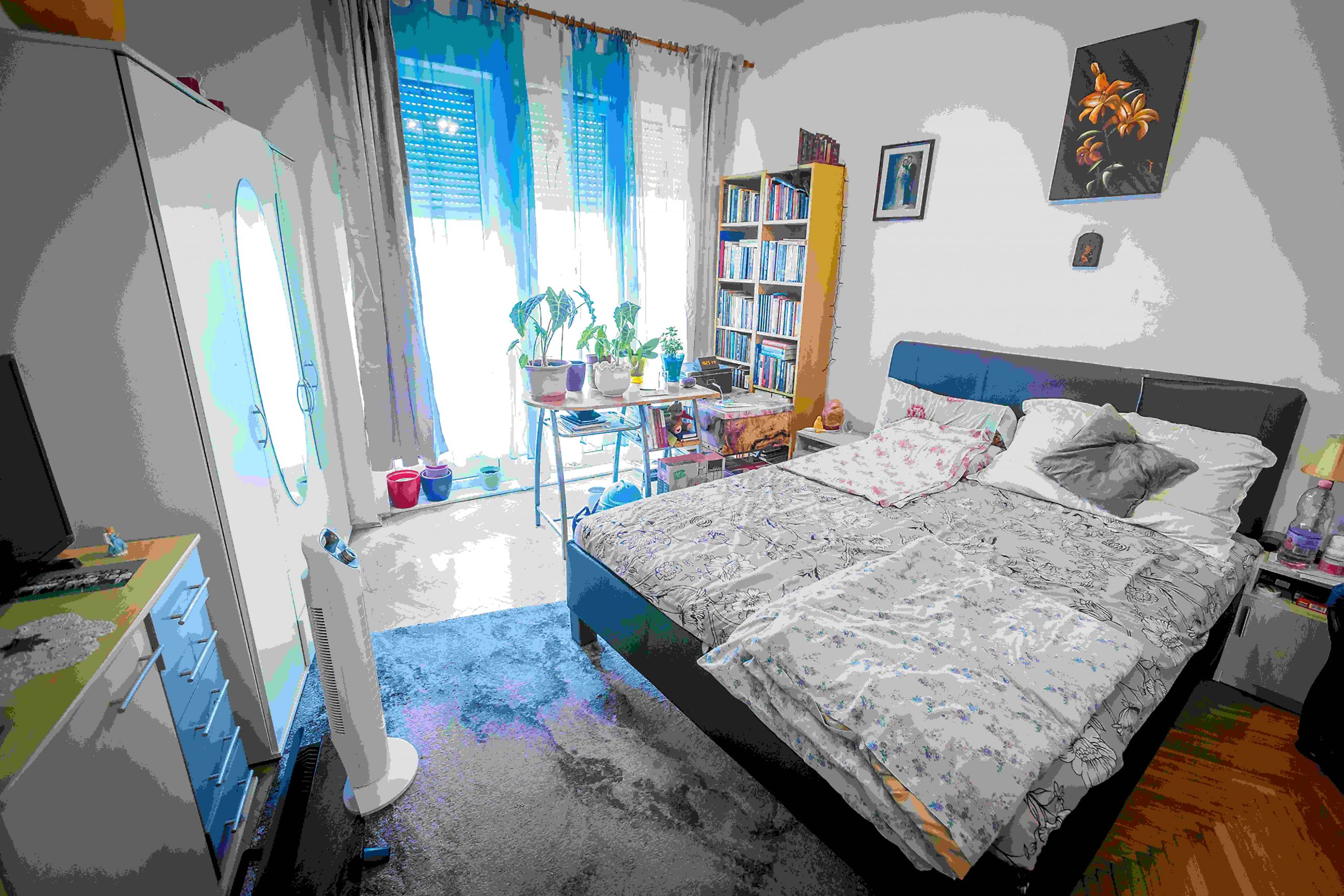 A meglepetésebéd után Pákó körbevezet minket az otthonában. Megmutatja parányi konyháját, az éjszakába nyúló beszélgetéseknek helyet adó nappalit, és a fürdőszobába is bepillantást nyerhettünk, ahol mint kiderült, a lakás ura, pontosabban bérlője, több időt tölt szépítkezéssel, mint szerelme, Gyöngyi.