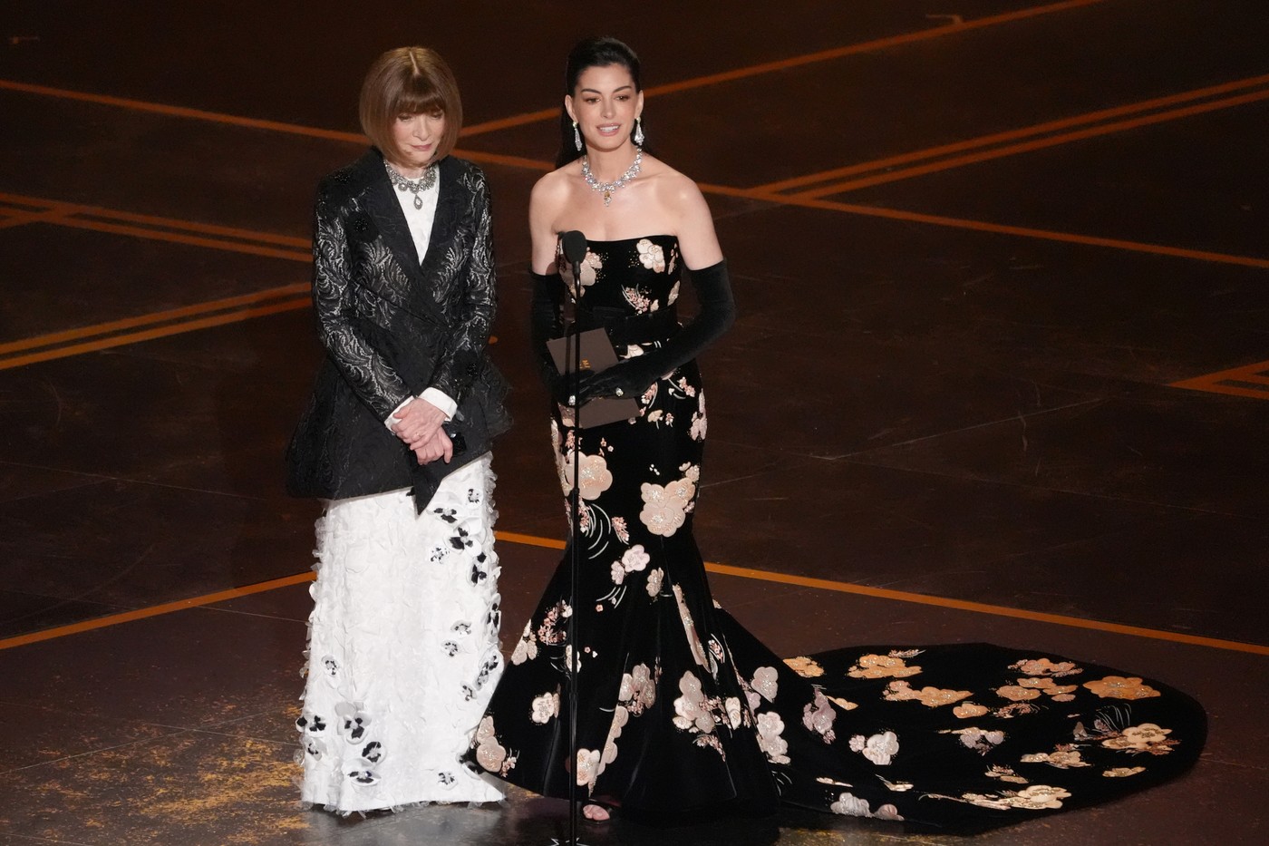 Nagy feltűnést keltett Anne Hathaway is, és nem csak a királynői, virágmintás vintage Valentino ruhája miatt. Hanem mert a színpadon együtt jelentek meg a Vogue nagyasszonyával, a tetőtől talpig Diorba öltözött Anna Wintourral. Kettősük természetesen még inkább felfokozta a várakozást Az ördög Pradát visel 2 küszöbön álló, május eleji bemutója iránt.