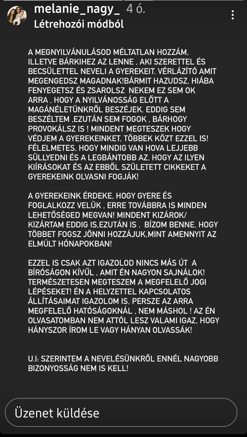 Nem kellett sokat várni Melanie válaszára sem, ami szerda reggelre meg is érkezett, szintén az Instagram-oldalán. Az édesanya vérlázítónak és méltatlannak tartja G.w.M írását, szerinte ugyanis szeretettel, becsülettel neveli a gyermekeit, akiket állítása szerint a rapper alig látogat, ellenben őt fenyegeti és zsarolja. „A gyerekeink érdeke, hogy gyere és foglalkozz velük. Erre továbbra is minden lehetőséged megvan! Mindent kizárok/kizártam eddig is. Ezután is. Bízom benne, hogy többet fogsz jönni hozzájuk, mint amennyit az elmúlt hónapokban!” – áll az édesanya válaszában. Aki követi a rappert, jól tudja, hogy él-hal a gyermekeiért, és ritkán ragadják el ennyire az érzelmei, sokszor hangoztatta azt is, hogy nagyon szeretne megegyezni a gyerekek láthatásáról, de úgy tűnik, erre már csak bírósági úton lesz lehetősége.