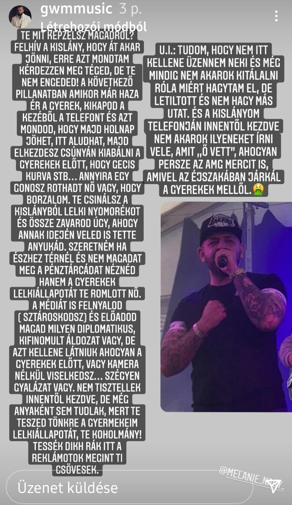 Elszabadultak az indulatok a rapper és Nagy Melanie között. G.w.M kétségbeesett, hogy nem lehet a gyerekeivel.
