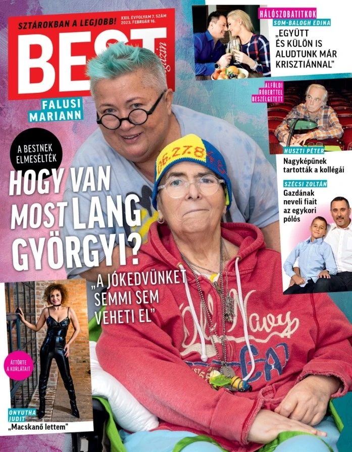 Hosszú idő óta először adott interjút, és vállalt fotózást Lang Györgyi, aki most állapotáról is mesélt. „Teljesen jól vagyok, ennek ellenére folyamatos felügyelet alatt állok, szinte egy percig nem lehetek egyedül. Tudom, szükségem van a segítségre, hisz nem tudom magam ellátni. De hogy még éjjel sem hagynak aludni, no, azt már nem! Jó alvó vagyok, éjfélkor lefekszem, délelőtt tízig meg sem mozdulok, ennek ellenére alig tudom elérni, hogy magamra hagyjanak. Volt idő, hogy Maji – így tudja csak kimondani a barátnője nevét – hetente kétszer is itt aludt nálam, és éjnek közepén azzal riasztott fel: ’Györgyi, Györgyi, jól vagy?’” – mesélte a Bestnek. A lap megjegyezte, hogy Györgyi az interjú során nehezen formálta a szavakat, Falusi Mariann segített tolmácsolni mondanivalóját.