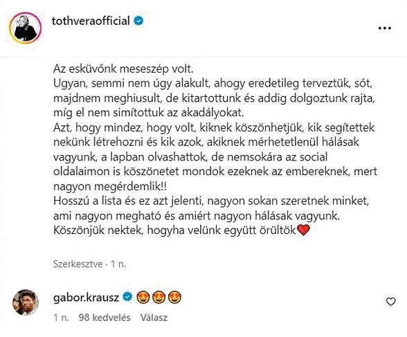 Az érzelmek ugyanis, nagyon úgy fest, egyik oldalon sem múltak el. Hiába jött a képbe egy harmadik fél a Fricska táncosa, Papp Máté Bence személyében, akivel úgy tűnik, Gabi máris új életet kezdett. Az énekesnő ugyanis ugyanúgy üzenget a férjének, ahogy Krausz neki. Először a séf jelentkezett egy beszédes videóval egy héttel azután, hogy nyilvánosságra hozta a válásukat, sorai közt elrejtve az okot: a Fricska táncosát. Most viszont mintha a dühét és csalódottságát a dac váltotta volna fel. Az Instagram-történetében megosztott felvételén ugyanis éppen edz, a videó alá pedig az X-Faktor egykori győztesének, Alee-nak a Nincsen gond című számát vágta be, aminek szövegét hallgatva egyértelmű képet kapunk róla, hogy is van most: „Lesz*rom, nincsen gond, építem az életem. Lesz*rom, minden jó, mert az égiek velem. Ez lett az életem, sok volt a sérelem, tudom, hogy te nem érted. Lehet, hogy éhezem, millió érzelem, de tesó, csak zenélek…” – szól a dal. Mire Gabi kisvártatva a Gladiátor című film híres betétdalával, a Now We Are Free-vel – magyarul Most már szabadok vagyunk – jelentkezett be. Tette mindezt a Mátéval hivatalosan első közös, horvátországi nyaralásán. Azaz a legnagyobb szerelem közepette is azonnal a férje posztjára reagált… Fontos azonban hozzátenni, hogy az éremnek mindig két oldala van. Valóban furcsa, hogy Gabi pár hete még az idilli családi boldogságát hirdette, de nem tudhatjuk, mi vezetett odáig, hogy hirtelen mindent borított, és ennyire vissza akarta kapni a szabadságát...