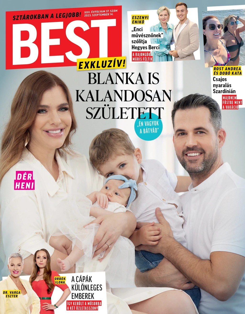 Júliusban született meg Dér Heni és Bakos Gergő második gyermeke, Blanka. Az énekesnő eddig nem posztolt a babáról, ám most a legfrissebb Best magazinnak megmutatták a kicsit. Elmesélte, kisfia, Bendegúz úgy bánik a húgával, mint a hímes tojással. „Ami pedig a legjobb, hogy egyáltalán nem féltékeny rá, ami talán annak is köszönhető, hogy amibe csak lehet, bevonjuk őt is. Például a fürdetésnél is segédkezik, vagy amikor tisztába tesszük a kicsit, ő adogatja a krémet, a pelust. Mivel Beni még csak két és fél éves lesz, értelemszerűen nem merem a kezébe adni a húgát” – mesélte Dér Heni a magazinnak.