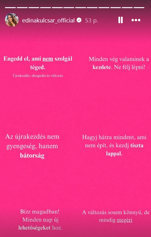És csak olaj a tűzre, hogy Edina most sokatmondó, fájdalmas gondolatokat osztott meg közösségi oldalán. „Engedd el, ami nem szolgál téged. Minden vég valaminek a kezdete. Ne félj lépni!” – kezdte Edina a 24 óráig elérhető bejegyzésében, amiben az újrakezdésről és a változásról is megosztotta a gondolatait.