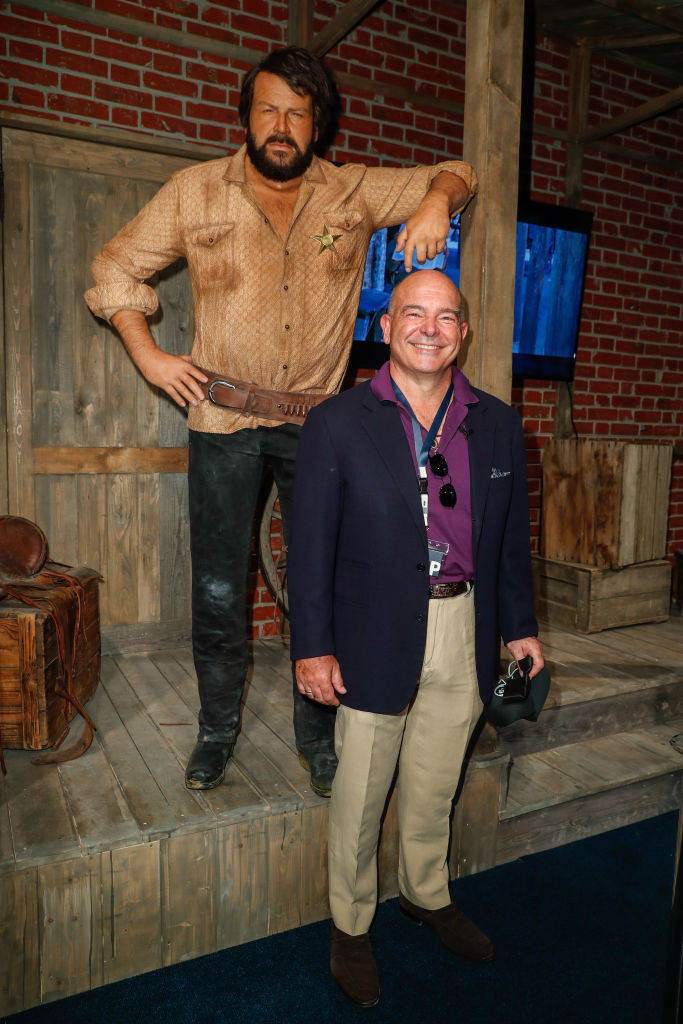 Giuseppe Pedersoli édesapja szobra előtt a berlini Bud Spencer Múzeumban