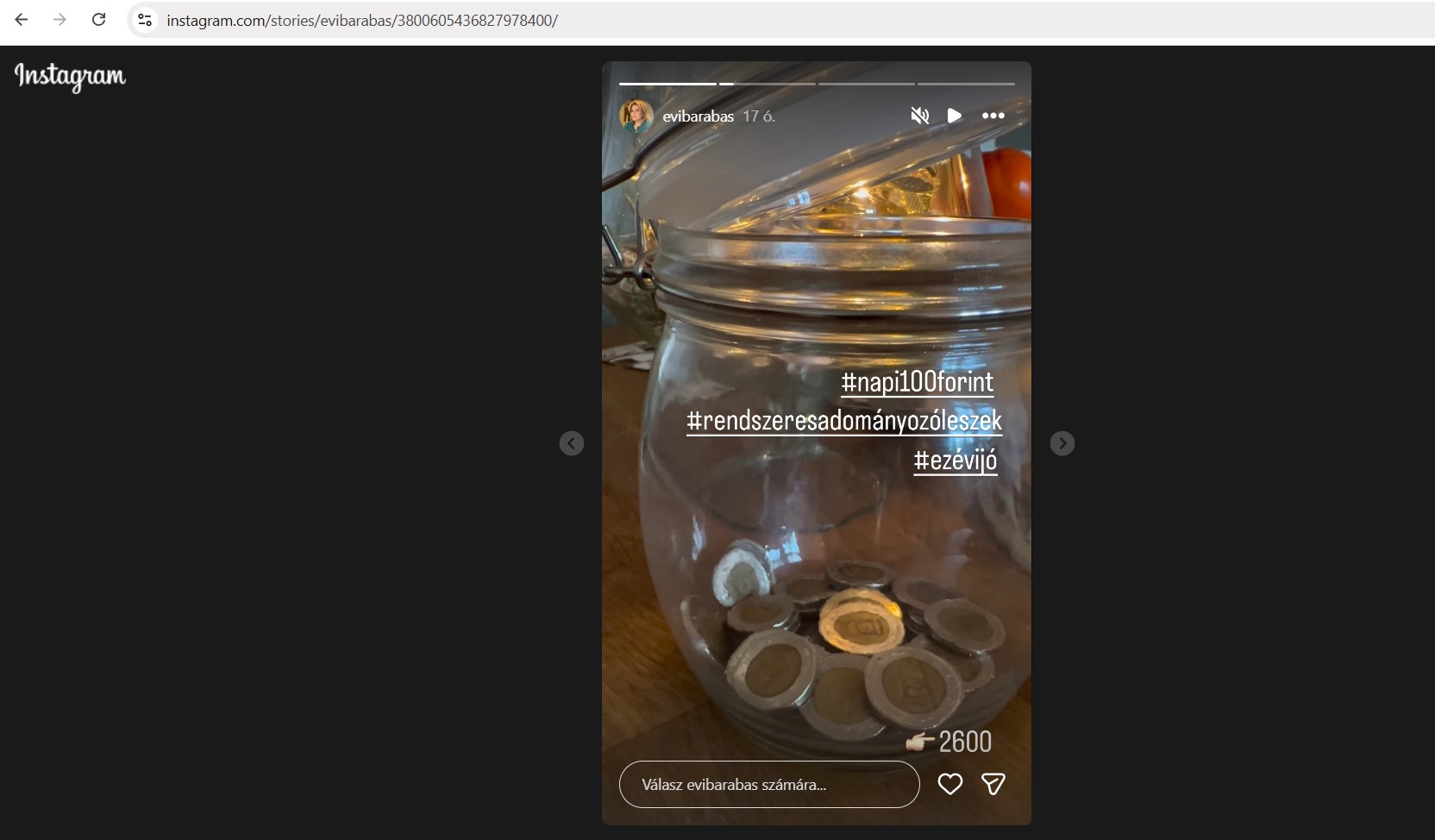 Napi száz forint nem sok, de kitartással – és persze összefogással – a kis pénzből is összegyűlhetnek komoly vagyonok. Ebben hisz Barabás Évi, aki ezúttal közösségi oldalán követőinek is megmutatta, milyen spórolásba kezdett tavaly év végén. Ezentúl minden nap egy száz forintos érmét dob egy csatos üvegbe és #a rendszeres adományozó leszek hastaggel üzent.